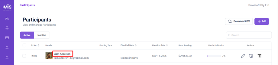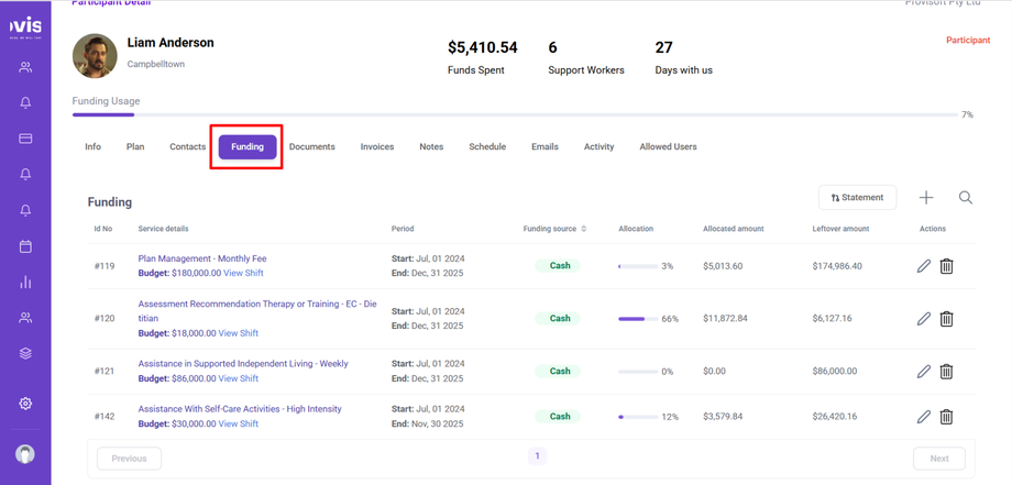 Click on the Funding tab to open the Funding Section, There you will be able to see the list of the funding that are associated with that Participant.