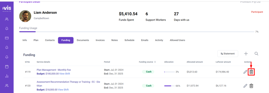 Deleting a funding means permanently removing a specific funding source for participant from the system. This action ensures the specific funding can no longer be used for assigning shifts.