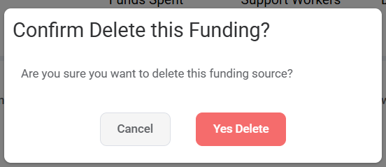 Clicking a Delete(Trash Bin) icon a prompt will appear with the options to Cancel or Yes Delete. If you still wish to delete the Funding click yes Delete, if not then select Cancel.