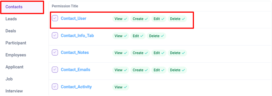 - To Delete the Contacts You will need to have Permission : Contact > Contact_User >> Delete : Yes