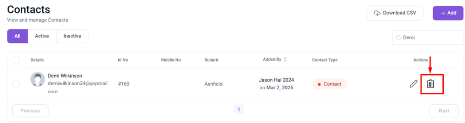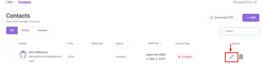 To edit the Contact, first locate the contact using the search option. Then click on the Pencil(Edit) icon next to the Contact you want to edit.