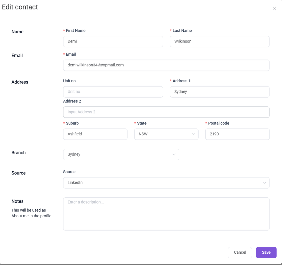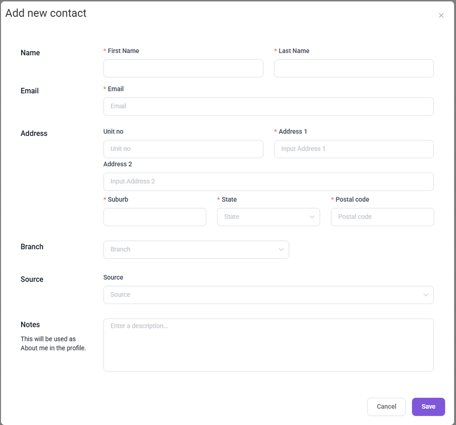 - Address : Includes fields for Unit No, Address 1 (required), Address 2, Suburb (required), State (dropdown selection, required), and Postal Code (required).