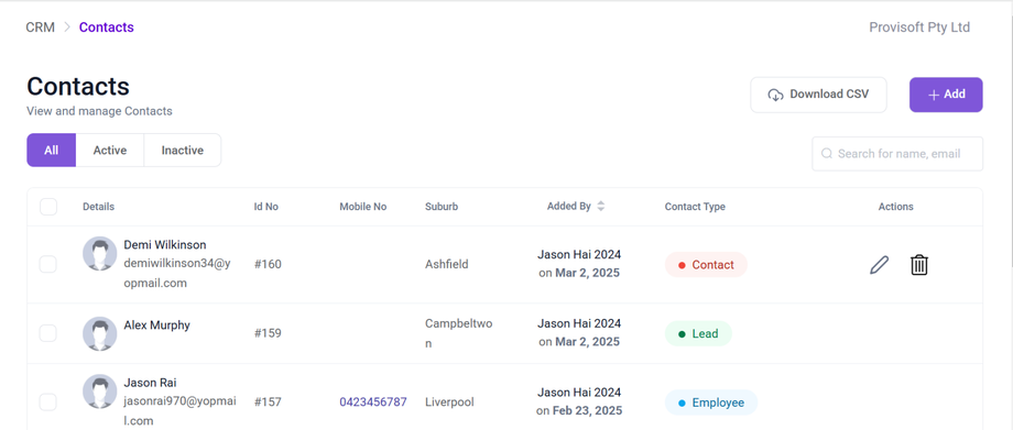 Clicking on the Contacts, opens up a below page where you can view and manage the contacts.
