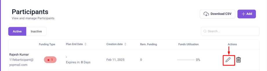 To edit the participant, first locate the participant using the search option. Then click on the Pencil(Edit) icon next to the participant you want to edit.
