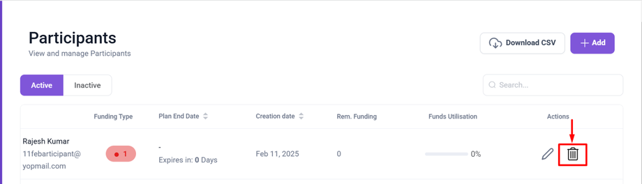 To delete a Participant simply click the delete(Trash bin) Icon next to the participant you want to delete.