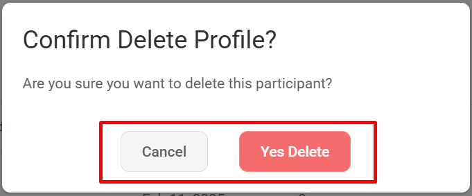 Clicking a Delete(Trash Bin) icon a prompt will appear with the options to Cancel or Yes Delete. If you still wish to delete the Participant click yes Delete, if not then select Cancel.