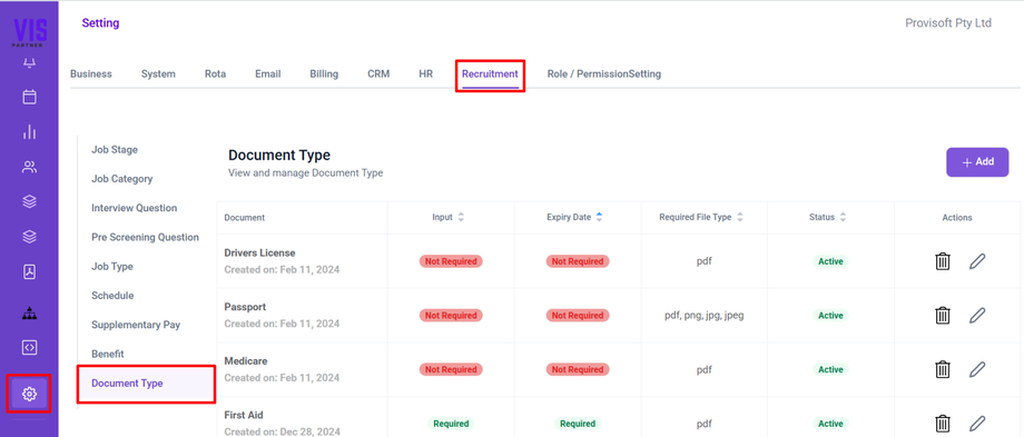 Using the side bar menu click on the settings > Navigate to the Recruitment tab and click on the Document Type Section.
