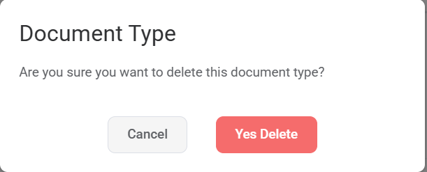 Clicking a Delete(Trash Bin) icon a prompt will appear with the options to Cancel or Yes Delete. If you still wish to delete the Document Type click yes Delete, if not then select Cancel.