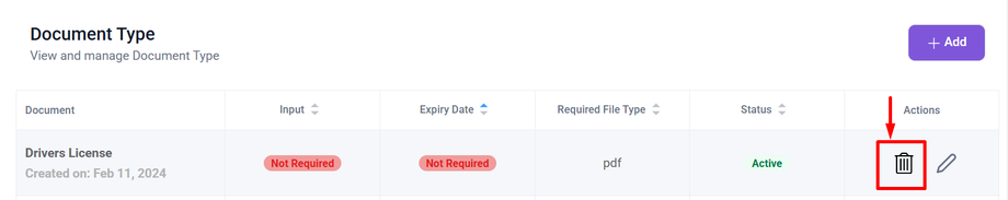 To Delete the Document Type, first locate the Document Type from the list then click on the Trash Bin(Delete) Icon next to the Document Type.
