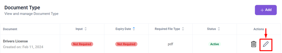 To Edit the Document Type, first locate the Document Type from the list then click on the Pencil(Edit) Icon next to the Document Type.