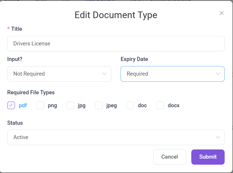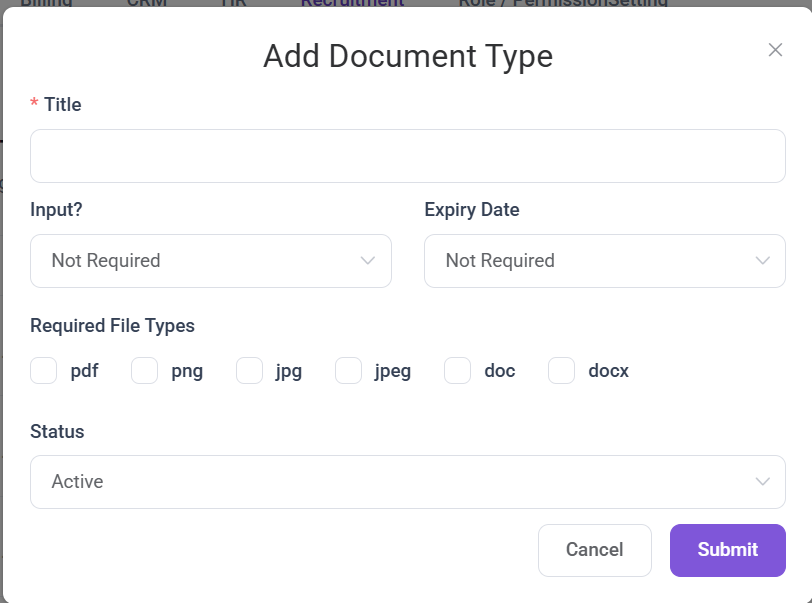 In any organization, managing documents efficiently is crucial for compliance and smooth operations. The Document Type Management feature allows you to define the types of documents that can be uploaded in the system and specify their allowed formats.