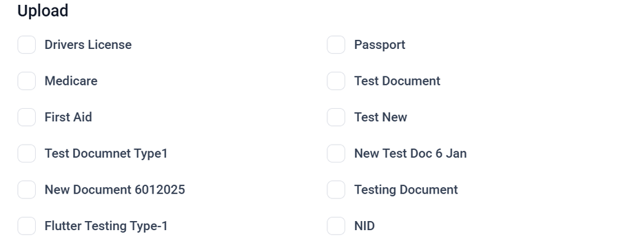 The Upload Documents section allows to choose necessary documents that need to be upload by the applicant. You can select the required documents from the available options. You can check the boxes for the required documents that are needed.