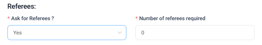 The Ask for Referees? dropdown provides an option to choose Yes or No, determining if referees need to be collected from the applicant. The Number of Referees Required field lets users specify how many referees the applicant must provide.