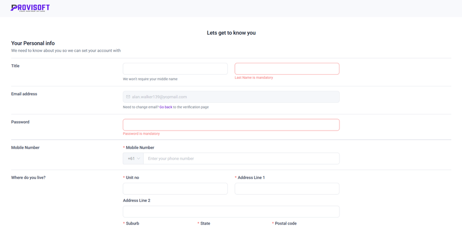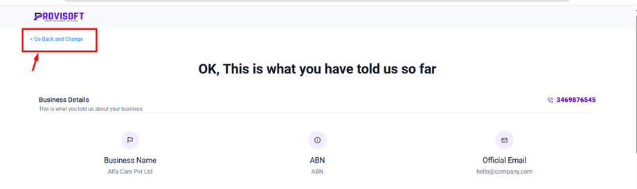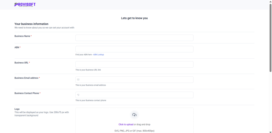 After Providiing your personal details, the next step is to fill out your business details so Provisoft can create your company profile.