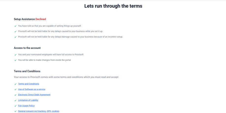 Now, you will be redirected to the page where Provisoft outlines the legal agreements and terms you must acknowledge before proceeding further.