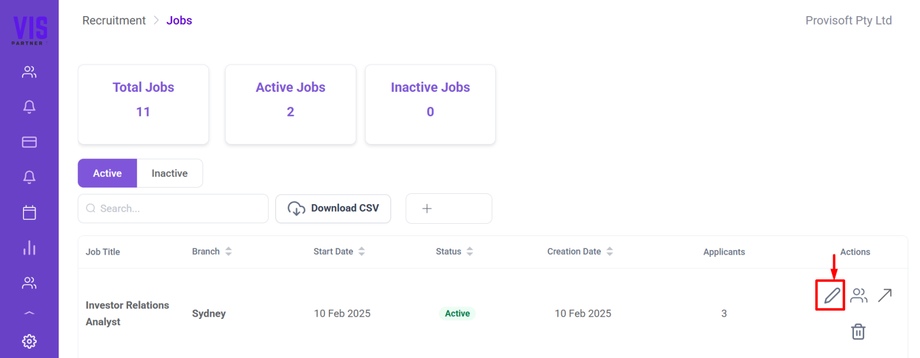 Navigate to the Recruitment Section from the sidebar and Click on Jobs to view the list of created jobs.