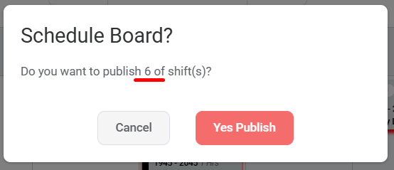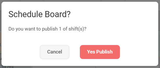 After selecting all the shift that you need to publish click on the publish button. This will show the Prompt where you will see the number of shift you have selected and the options to Cancel or Yes Publish.