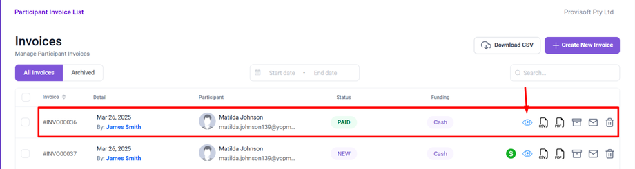 To view the generated invoice, you can click on the Eye icon, next to the invoice you want to view.