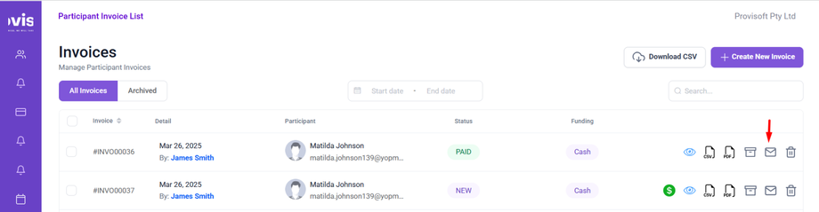 Click on the envelope icon next to the invoice you want to send to the Participant.