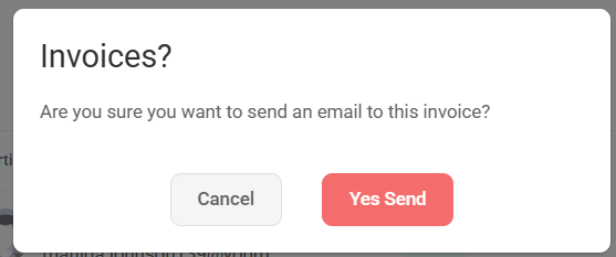 Clicking a Envelope Icon, a prompt will appear with the options to Cancel or Yes Send. If you wish to Send the generated Invoice click >Yes Send, if not then select Cancel.