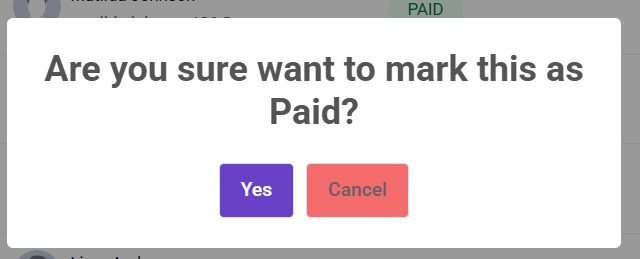 Clicking a Dollar Icon, a prompt will appear with the options to Yes or Cancel. If you want to mark the Invoice as paid click >Yes if not then select Cancel.
