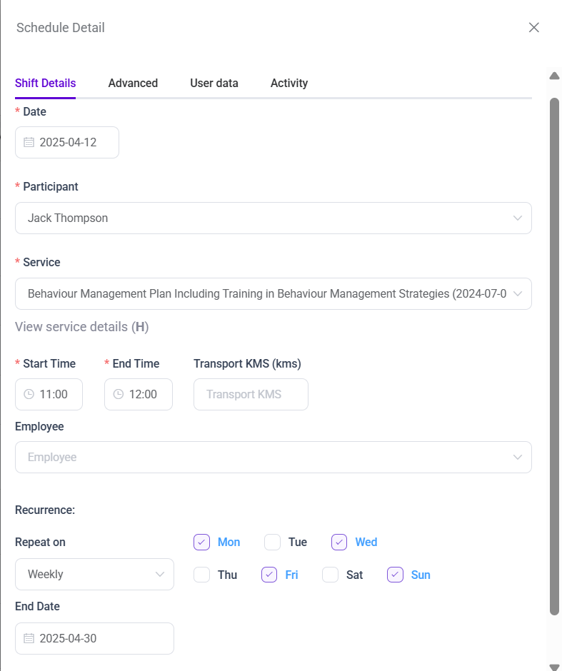 Setting up recurring shifts is an effective way to save time during scheduling. A recurring shift refers to a shift assigned to the same Participant, occurring at the same time of day, for the same duration and at the same location, across two or more different days. Shifts that vary in time or involve different Participant are treated as separate, unique shifts.